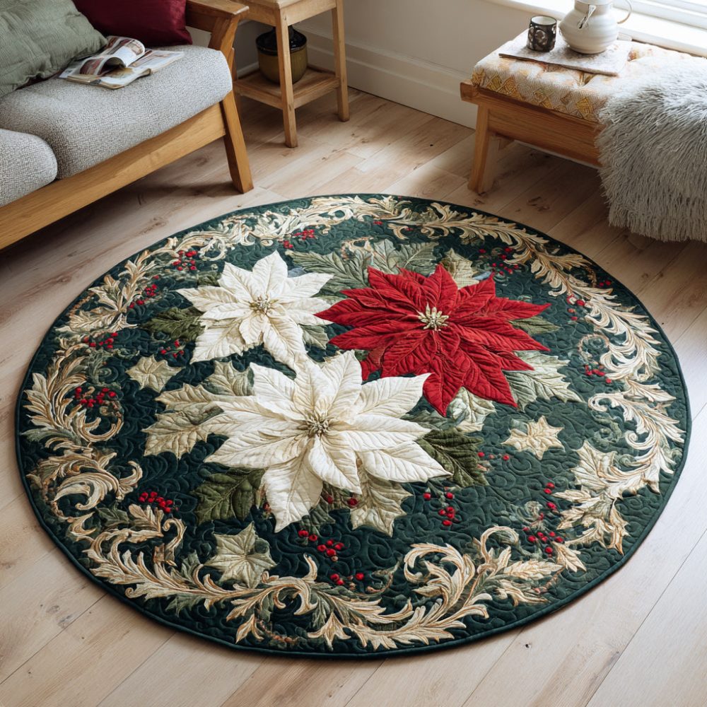 White Poinsettia Wreath Quilted Round Mat