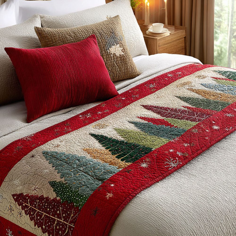 winter forest bed runner,forest quilted runner,rustic bedding accent,scandinavian bedroom decor,cabin bed scarf,seasonal bed runner,nature inspired bedding