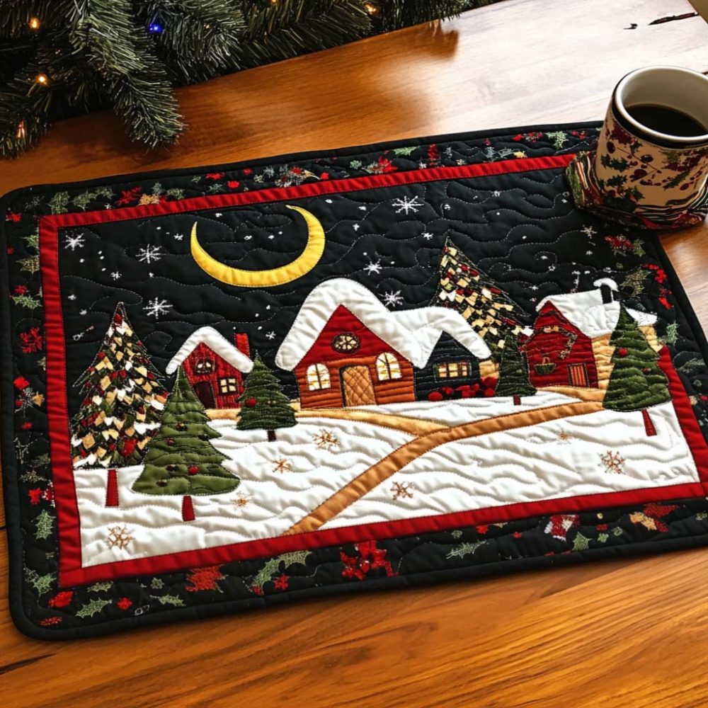 Winter Village Quilted Placemat — Festive Snow Scene Cotton Table Mat, Holiday Dining Decor, Durable & Easy-Care