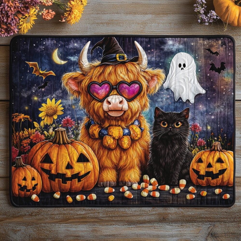 witchy cow placemat, Halloween placemat, quilted placemat, spooky table decor, witch hat cow, seasonal entertaining, novelty placemat
