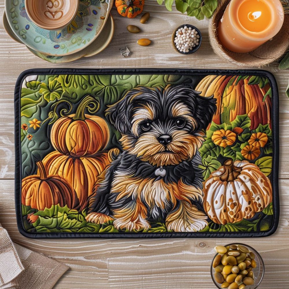 cozy yorkie placemat,autumn terrier mat,pumpkin motif placemat,quilted farmhouse table mat,machine washable kitchen mat,non-slip yorkie decor,pet lover gift