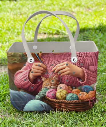 Charming Knit & Cat Tote Bag – Colorful Yarn Design, Perfect For Craft Lovers
