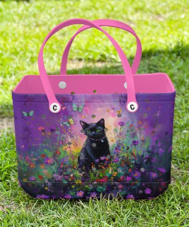 Enchanting Black Cat Tote Bag With Floral & Butterfly Design – Vibrant Purple, Perfect For Cat Lovers!