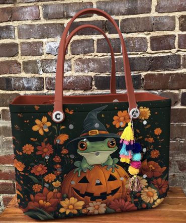 Enchanting Frog Witch Halloween Tote Bag – Cute Pumpkin & Flower Design, Perfect For Spooky Season Shopping
