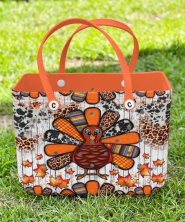 Festive Turkey Tote Bag – Vibrant Autumn Design With Leaves & Animal Print, Perfect For Thanksgiving Shopping